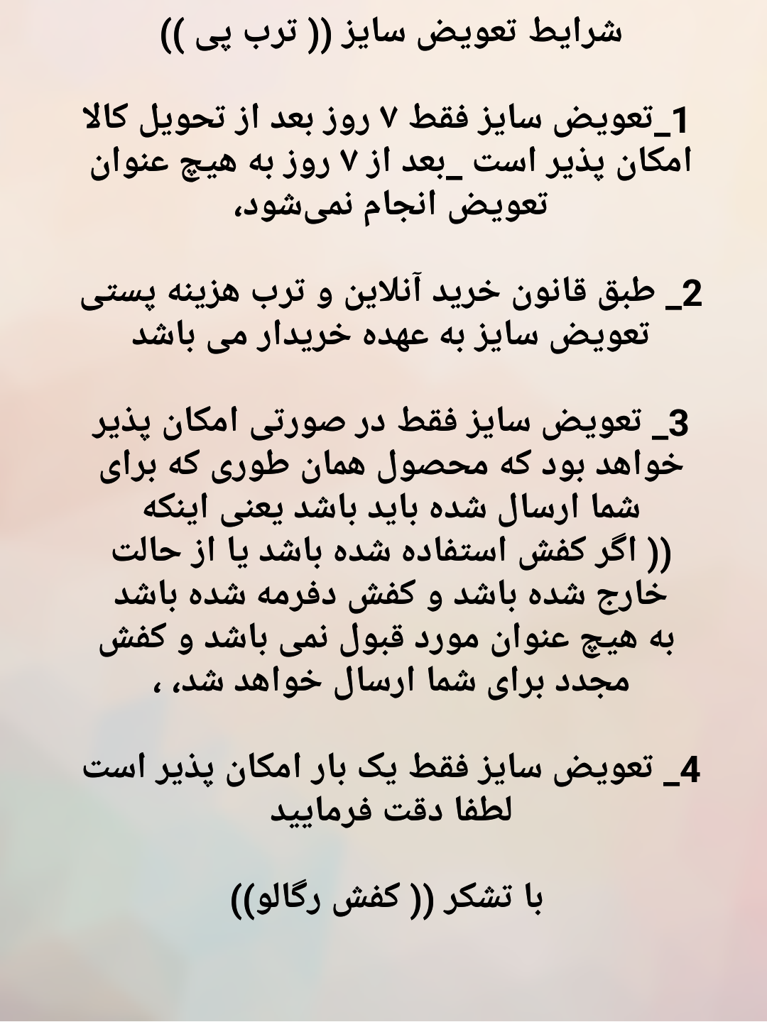 مشتریان محترمی که کفش به دست شون رسیده و مشکل سایز دارن مجموعه رگالو با احترام امکان تعویض سایز برای شما فراهم است